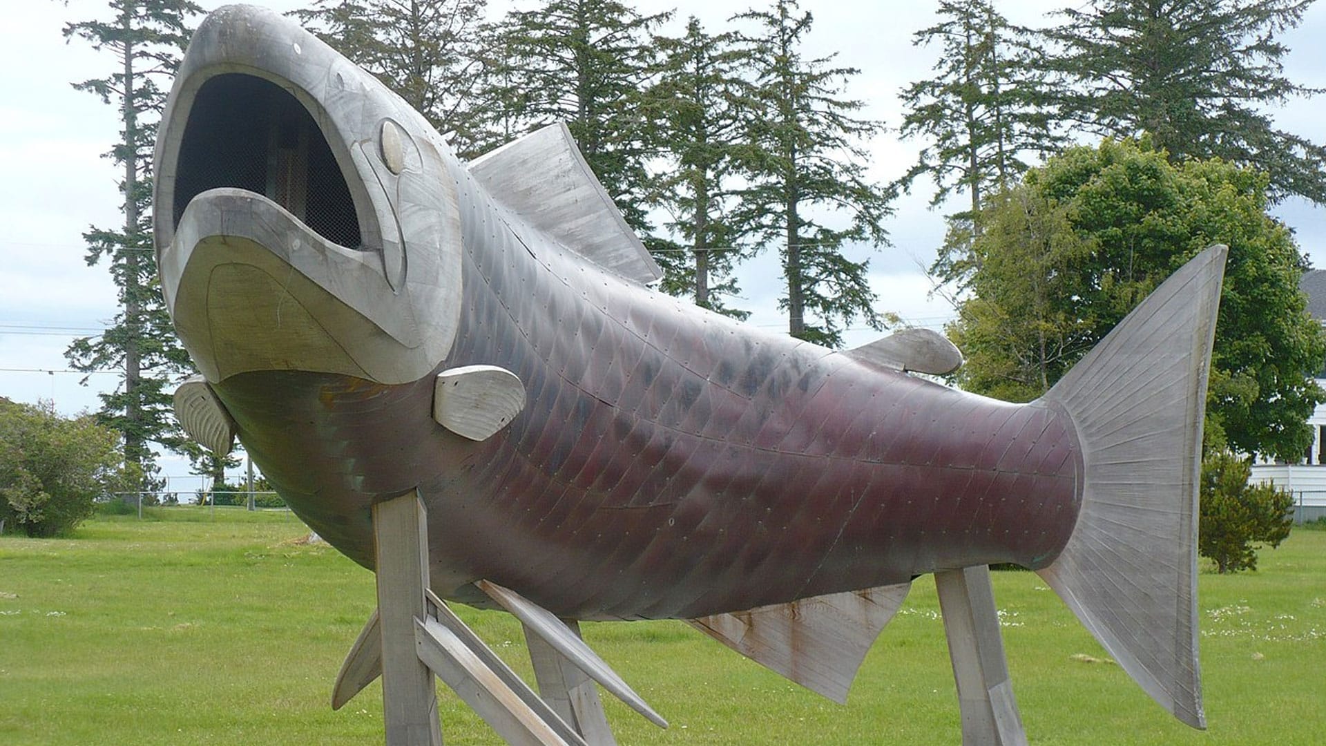 The “Spirit of Sandspit” sculpture by Lon Sharp. It is a large sculpture of a salmon made of copper, wood, and other materials.